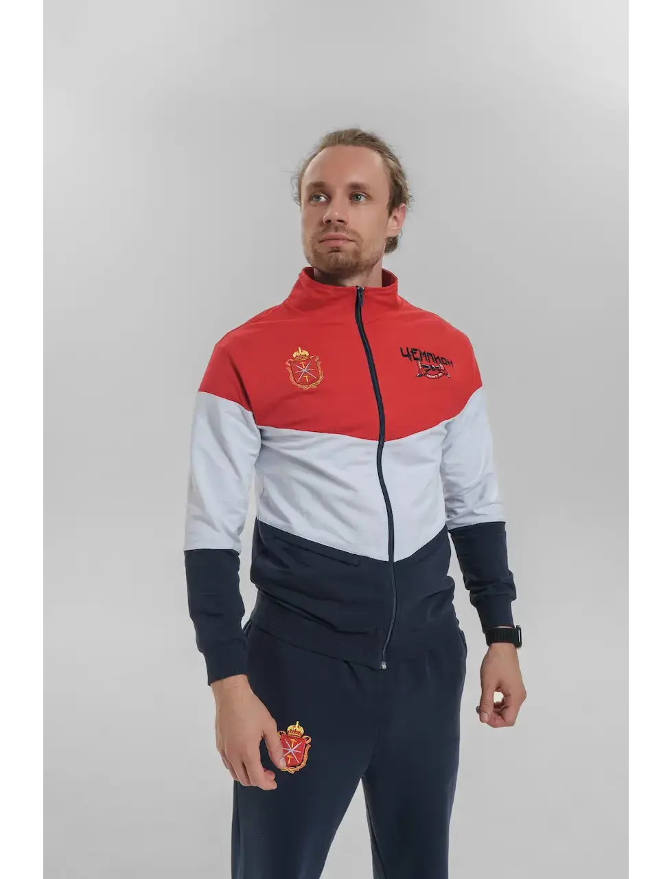 Костюм Карате состоит из олимпийки и брюк.Олимпийка: свободный силуэт, центральная застежка на молнию. Три цветные вставки. Спереди внутренние 2 кармана на молнии. Вышивка логотипа.Брюки: полуприлегающие прямые, пояс на эластичной ленте и регулируется дополнительно шнуром выходящим с внутренней стороны пояса. Боковые внутренние карманы, нижняя часть брюк собрана на манжет.