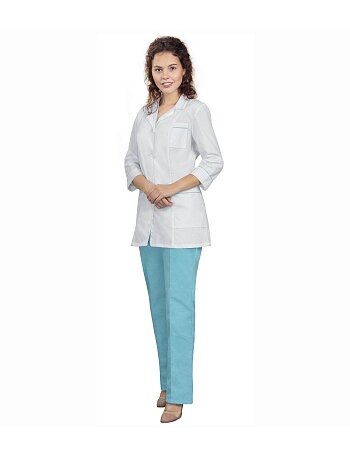 Костюм Лаборанта женский состоит из куртки и брюк.Детали и кант из отделочной ткани. Куртка:отложной воротник с лацканами, центральная застежка на пуговицах;рельефные швы на полочках и спинке;карманы – нагрудный слева, боковые накладные;рукава 3/4;регулировка объема – хлястики на пуговицах (по линии талии на спинке). Брюки:пояс с эластичной лентой.