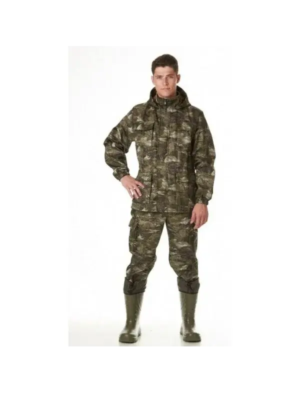 Костюм "Лесничий" полофлис состоит из куртки и брюк. Куртка прямого силуэта, с воротником - стойкой, с центральной бортовой застёжкой на молнию,ветрозащитным клапаном, застёгивающимися на тесьму "контакт". Капюшон втачной, по лицевому вырезу стягивается шнуром.По линии талии настрочена кулиска, с регулирующим шнуром и фиксаторами.Брюки на молнии, притачном поясе со шлёвками, собранном на резинку. На передних половинках обработаны два кармана, в области боковых швов настрочены два накладных кармана - книжки с клапанами.