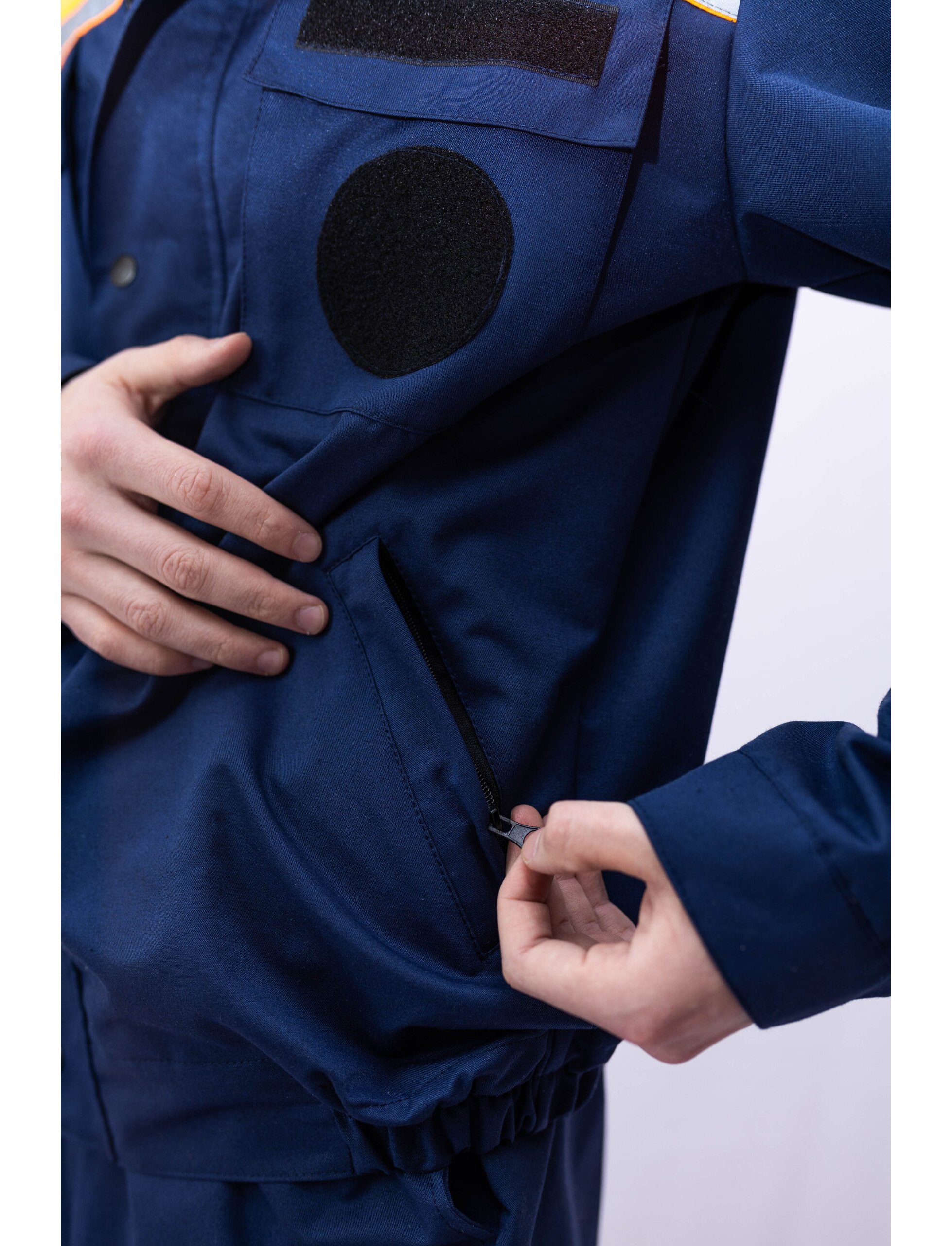 Светоотражающие полосы – по груди, спинке, в нижней части рукавов и брючин.