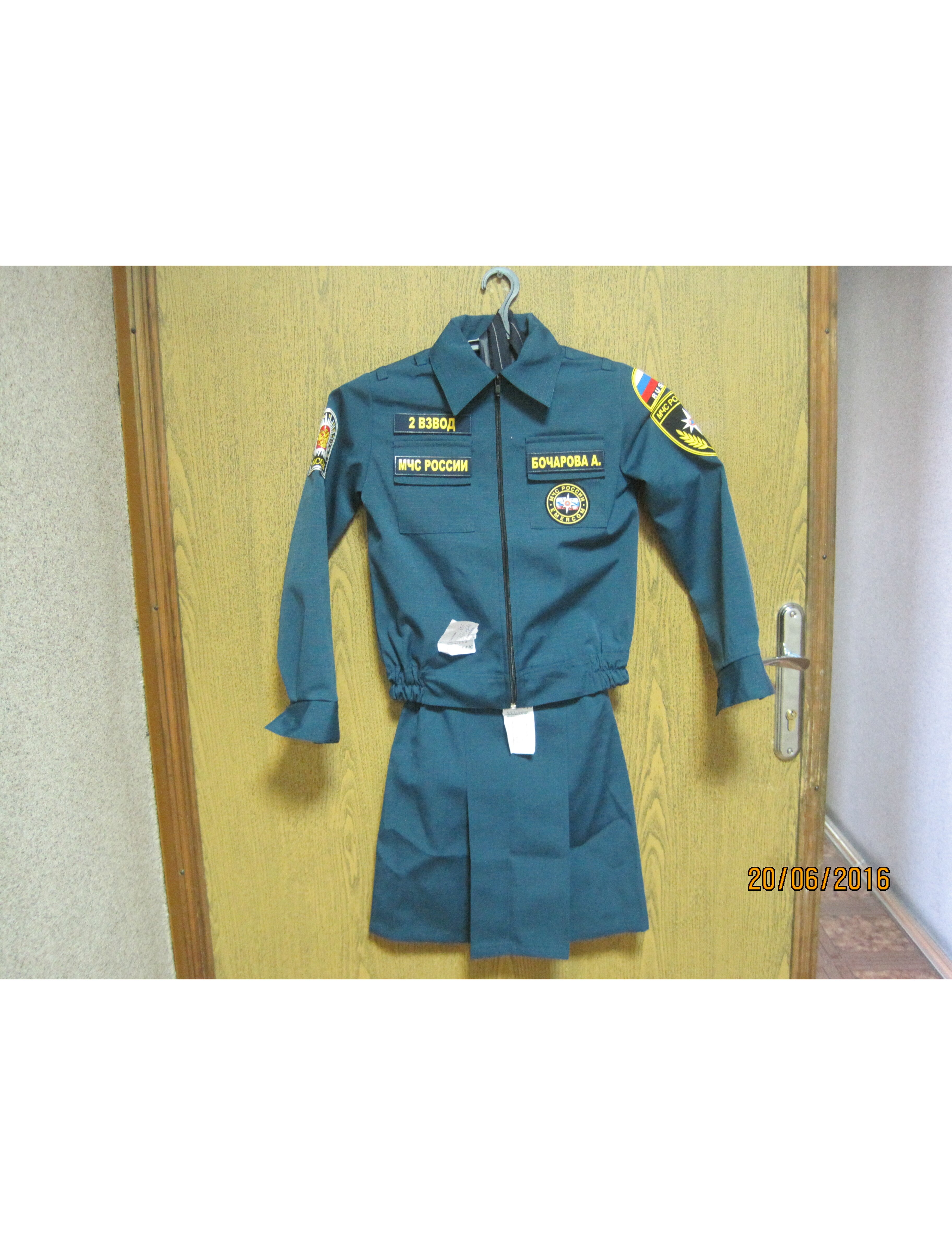 Костюм МЧС для девочек состоит из куртки и юбки. Куртка с отложным воротником, с застежкой на тесьму - "молнию". Полочки с верхними накладными карманами с клапанами, застегивающимися на липучку, с боковыми прорезными карманами с двумя обтачками и застегивающимися на тесьму - "молнию". Рукава втачные, одношовные, с притачными манжетами, застегивающимися на пуговицу с гербом. На левом рукаве шеврон. В швы соединения рукавов с проймой в области плеча втачиваются погоны-хлястики, застегивающиеся на пуговицу с гербом. Куртка по низу с притачным поясом. Боковые части пояса стянуты эластичной лентой.