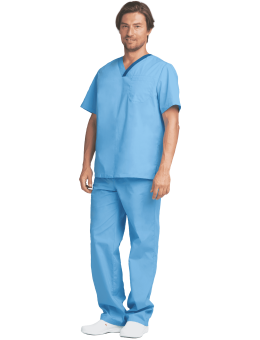 Костюм медицинский ХИРУРГ МЕДИКАЛ мужской - это специализированная рабочая форма для медиков, состоящая из куртки (блузы) и брюк, предназначенная для обеспечения гигиены, комфорта и свободы движений во время работы в больницах, клиниках и операционных, защищая как пациента, так и врача от инфекций и удобна для частых стирок, часто из смесовых тканей и свободного кроя. Костюм состоит из блузы и брюк. Блуза - свободного кроя, V-образный вырез горловины с декоративной отделкой, накладные карманы, спинка со средним швом, рукава втачные, короткие, боковые разрезы. Брюки - прямые по всей длине, пояс с эластичной лентой. Цвет - голубой Ткань - Ст-150. Состав: 65% полиэфир, 35% вискоза, плотность 150 г/м².