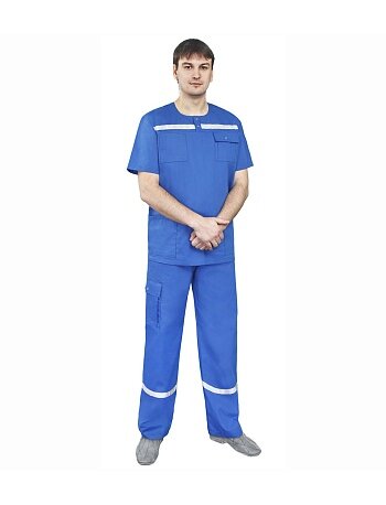 Костюм медицинский Скорая помощь состоит из блузы и брюк.Блуза:вырез по горловине, застежка на кнопках до низа кокетки;кокетки на полочках и спинке;карманы – нагрудные (слева карман с клапаном на кнопке), боковые накладные;укороченные рукава.Брюки:пояс с эластичной лентой; карман с клапаном на кнопке по линии бокового шва справа.