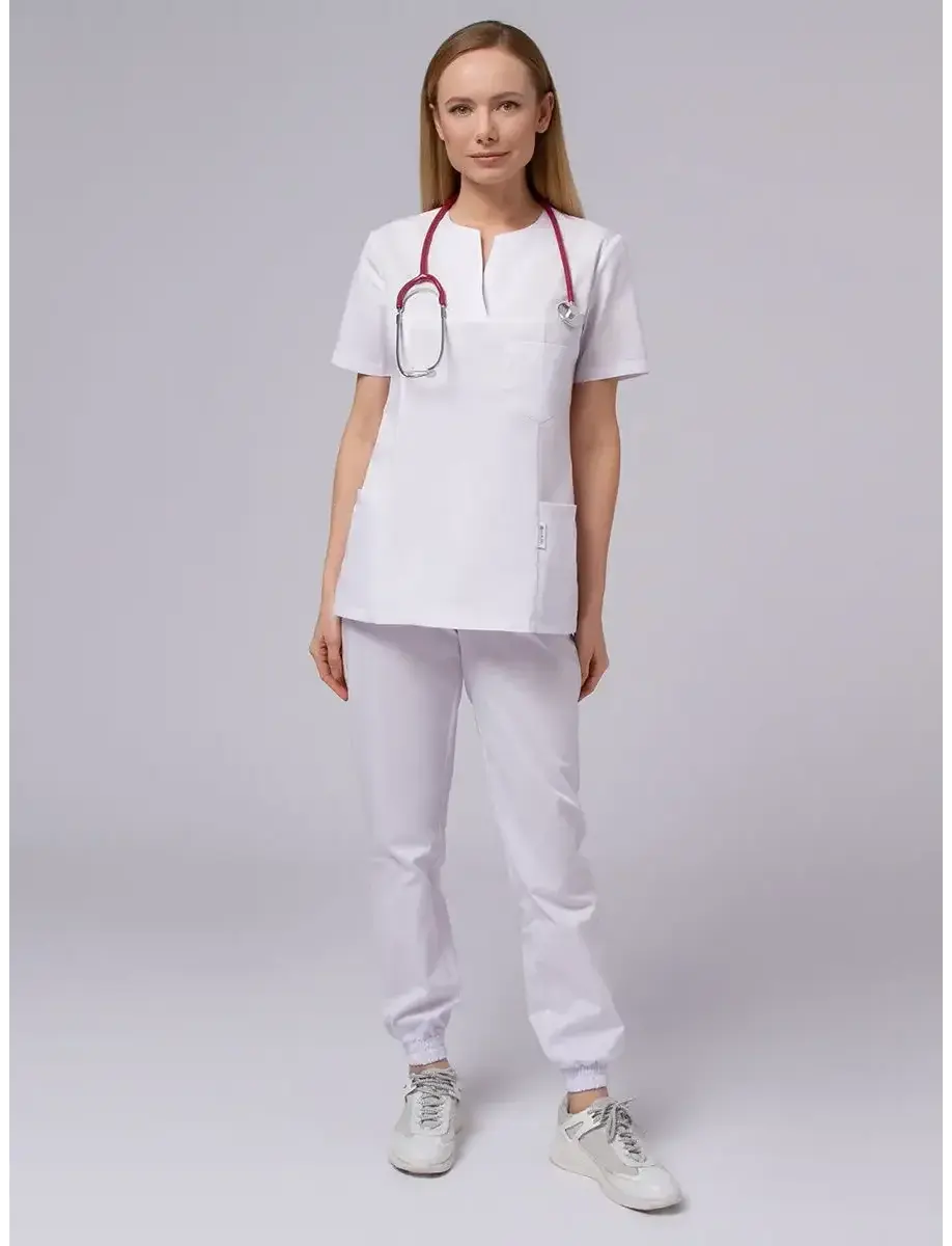 Костюм медицинский женский белый комплект, состоящий из брюк и рубашки. Такие костюмы используют работники стационаров, медсестры и санитары.Изготавливают из специальной ткани, которая обладает гигроскопическими свойствами, отталкивает биологические жидкости.Швы выполняются усиленные, дважды простроченные.