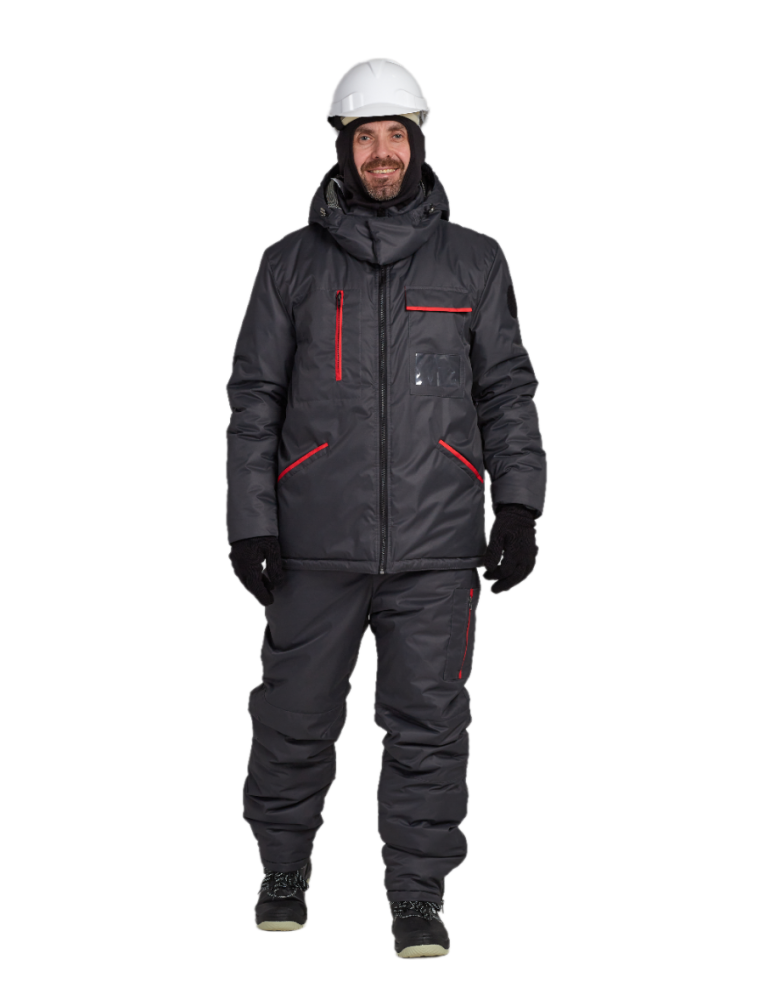 Костюм мужской черный для защиты от пониженных температур - это специализированная теплая спецодежда (куртка и полукомбинезон), утепленная синтепоном и ветрозащитной прокладкой, предназначенная для работников в холодных условиях (1-й класс защиты), защищающая от мороза, ветра, а иногда и от нефти, химикатов или воды. Куртка с притачной теплозащитной подкладкой на 1 слое утеплителя 200 г/м2, центральной застёжкой на металлическую "молнию", внутренней утеплённой ветрозащитной планкой, втачными рукавами, воротником-стойкой, втачным утеплённым капюшоном. Кулиса по линии талии позволяет регулировать объем и обеспечивает дополнительную защиту от холода и ветра. Полукомбинезон с притачной теплозащитной подкладкой на 1 слое утеплителя 200 г/м2, центральной застёжкой на металлическую "молнию", внутренней ветрозащитной планкой, трикотажными боковыми вставками, бретелями из эластичной ленты, застёгивающимися на замки-защёлки. Подкладка брюк с внутренними муфтами, с эластичной тесьмой по нижнему срезу. Цвет - черный, красный.