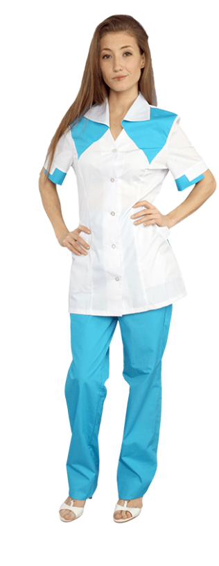 Куртка полуприлегающего силуэта, с центральной застежкой на пуговицы, с фигурной кокеткой из контрастной ткани, переходящий в отложной воротник, с нижними накладными карманами, короткими рукавами и хлястиком по спинке.По низу рукавов и карманам фигурные детали из контрастной ткани.Брюки прямые на резинке.