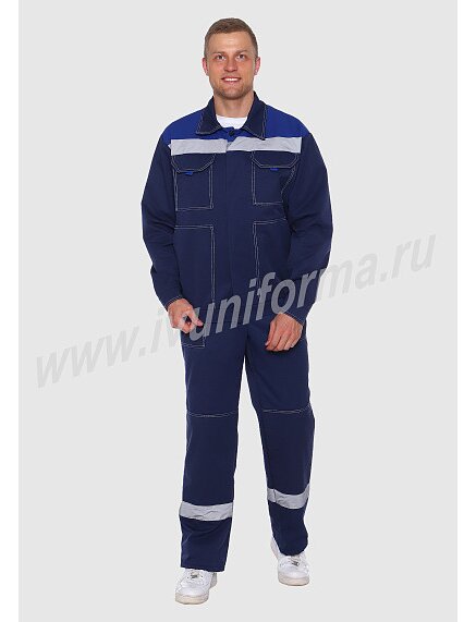 Костюм рабочий мужской арт. Р-02-9-ГР синий состоит из куртки и полукомбинезона. Куртка, укороченная с притачным поясом, стянутым по бокам эластичной лентой, с супатной застежкой на пуговицы, а также с усилением на логтях. Полочки и спинка на кокетках контрастного цвета. Сверху два накладных кармана на клапанах, снизу два накладных с "косым" входом. По кокетке в круговую проходит СОП 50 мм. Полукомбинезон выполнен с усилением на коленях, с боковыми накладными карманами и накладным нагрудным карманом с клапаном. СОП по низу брюк 50 мм. Костюм рабочий мужской с СОП предназначен для защиты от общепроизводственных загрязнений и производственных травм.