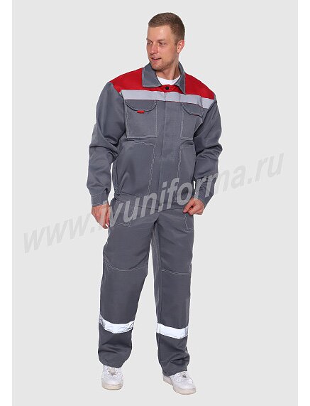 Костюм рабочий мужской арт. Р-02-9-ГР состоит из куртки и полукомбинезона. Куртка, укороченная с притачным поясом, стянутым по бокам эластичной лентой, с супатной застежкой на пуговицы, а также с усилением на логтях. Полочки и спинка на кокетках контрастного цвета. Сверху два накладных кармана на клапанах, снизу два накладных с "косым" входом. По кокетке в круговую проходит СОП 50 мм. Полукомбинезон выполнен с усилением на коленях, с боковыми накладными карманами и накладным нагрудным карманом с клапаном. СОП по низу брюк 50 мм. Костюм рабочий мужской с СОП предназначен для защиты от общепроизводственных загрязнений и производственных травм.