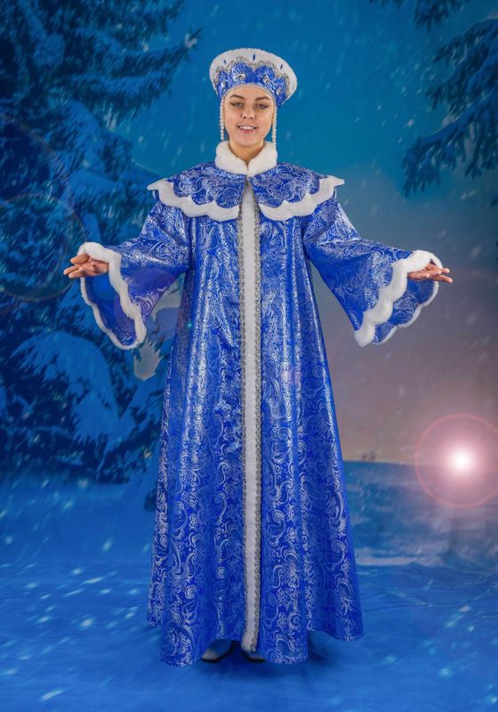 Костюм Снегурочки Гжель из парчи - это сказочный новогодний персонаж, внучка Деда Мороза, его постоянная спутница и помощница. Костюм выполнен из жаккардовой парчи с искристыми морозными узорами. Состав - 100% полиэстер. В комплект костюма входят: головной убор, шубка. Шуба, расклешенная от груди к низу, подойдет на размеры от 44 до 50. Костюм застегивается на пуговицы, спрятанные под декоративной меховой опушкой с ажурной серебристой тесьмой. Объемный воротник-кокетка с округлым фигурным меховым орнаментом мягко ниспадает на плечи Зимней Красавицы и застегивается на незаметную пуговицу. Украшением костюма является головной убор - кокошник, выполненный в традиционном русском стиле из жаккардовой парчи на жесткой основе. Головной убор богато расшит переливающимися камнями, искусственным жемчугом, тесьмой и белоснежным мехом. Застегивается головной убор на контактную ленту-липучку, что позволяет регулировать его размер.