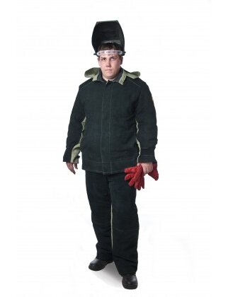 Костюм сварщика 2.5 м2 изготовлен из брезента ,спилка ,бязи и утеплителя.Куртка с центральной потайной застёжкой на петли и пуговицы.Воротник отложной,с накладкой из х/б ткани вдоль горловины.Под воротником располагается планка с петлямидля съёмного капюшона.Полочка изготовлена полностью из спилка.Бочок -из спилкаВ рельефных швах находятся внутренние карманы.Спина брезентовая ,со средним швом и настрочной спилковой кокеткой ,переходящей на перёд.В нижней части кокетки обработаны два вентиляционных отверстия.Рукав втачной,двухшовный.Верхняя деталь рукава-спилковая,нижняя деталь рукава -брезентовая.По низу рукава пата,регулирующая ширину рукава .В нижней части проймы ,под рукавом,обработаны вентиляционные отверстия.Все спилковые детали куртки с изнаночной стороны закрыты подкладкой из х/б ткани.Брюки с откидывающейся передней частью,которая пристёгивается к поясу на петли и пуговицы,с притачным поясомсо шлёвками под ремень,застёгивающимся спереди на пуговицу.В боковых швах карманы.Передние детали брюк изготовлены из спилка и брезента(верхняя часть).Весь перёд брюк ,с изнаночной стороны,обработан х/б тканью.Задняя верхняя часть брюк усилена брезентовыми накладками,нижняя часть усилена спилковыми накладками(запятниками).Пристёгивающийся ватный костюм состоит из куртки и брюк.Изготовлен из бязи и утеплителя.Куртка прямая ,с втачными рукавами,с ветрозащитным клапаном.Брюки с притачным расширенным поясом,с центральной застёжкой,с, регулирующими объём ,лямками по низу брюк.