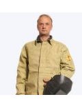 Костюм сварщика брезентовый состоит из куртки и брюк. Куртка с центральной бортовой застежкой на потайных пуговицах. Карманы прорезные в полочках. По линии соединения задней отрезной кокетки и под рукавами находятся вентиляционные отверстия. Брюки с откидывающейся передней частью. Задние половинки брюк с притачным поясом пристегиваются к передним цельнокроенным половинкам на пуговицы. Карманы прорезные в боковых швах.