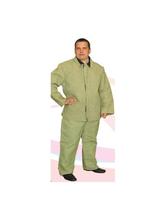 Костюм сварщика предназначен для защиты от теплового излучения и искр, состав – лен и хлопок.В области подмышек и по шву кокетки пробиты вентиляционные отверстия для отвода горячего воздуха изнутри куртки. На груди, на верхней части рукавов и на передней части брюк нашит спилок из натуральной кожи толщиной 0,9–1,1 мм. Пуговицы на куртке сделаны из термостойкого материала аминопласта и спрятаны в потайную застёжку. Карманы расположены в боковых швах. Все главные швы сделаны нитками высокой прочности и толщины и убраны внутрь изделия.