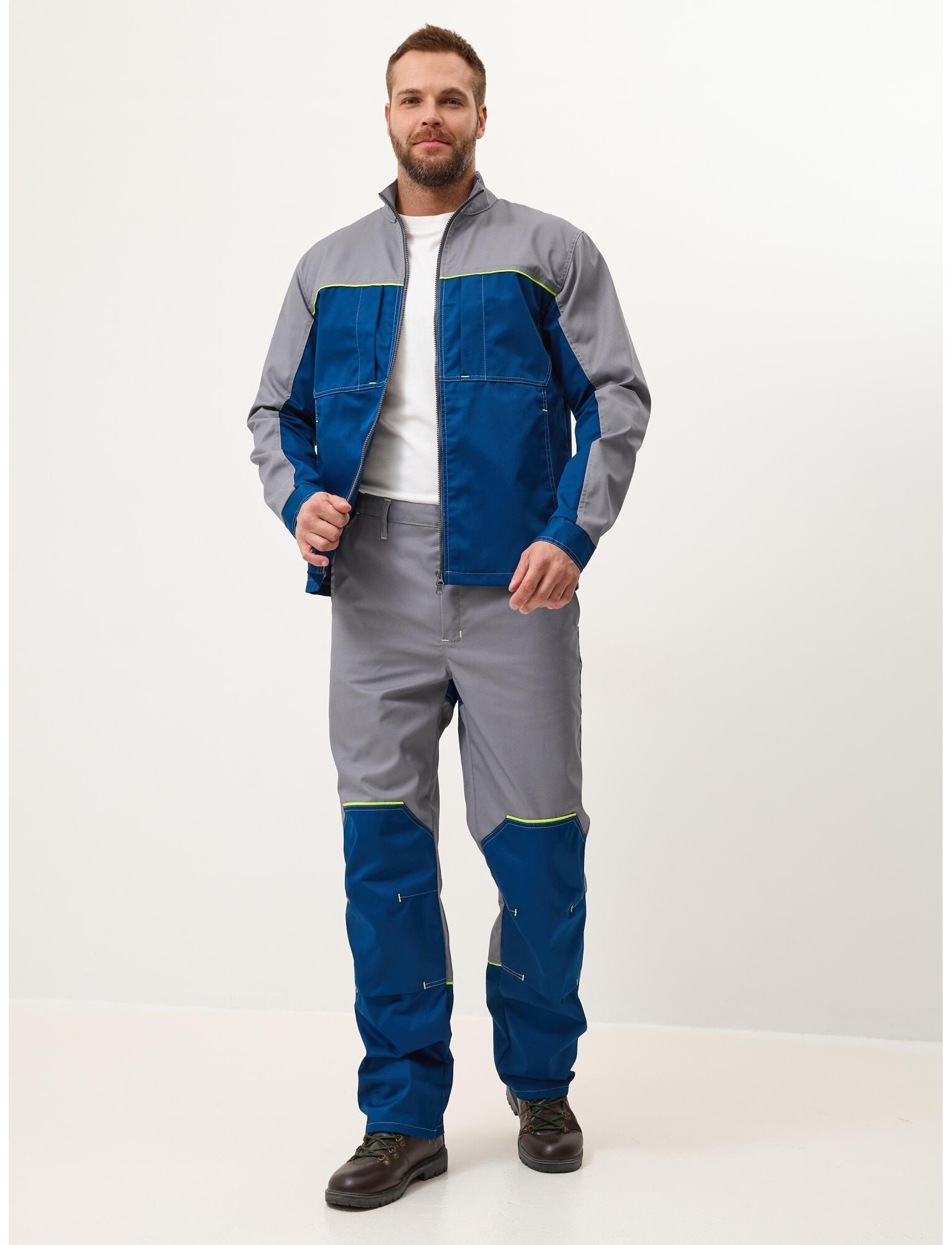 Костюм Волна-2 синий/серый состоит из куртки и брюк.Куртка: центральная застежка на молнию-трактор, воротник стойка, 2 нижних боковых кармана, 2 нагрудных с боковым входом и застежкой на металлические кнопки, по верху полочек и спинки кокетки, комбинированные рукава с манжетами и застежкой на металлические кнопки, все участки, подверженные нагрузке, усилены закрепками. Брюки: гульфик с молнией, настрочные передние карманы, фигурные настрочные наколенники с внутренним отделением под вкладыш, 2 задних настрочных кармана, пояс с шлевками и регулировкой по объему на пуговицы. Передняя застежка на пуговицу, все участки, подверженные нагрузке, усилены закрепками