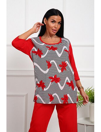 Костюм женский домашний "Парижанка" цветы/малиновый Н представляет собой пижаму женскую, состоящую из футболки с рукавом 3/4, полочка с принтом и бридж. Весь комплект свободного кроя - для комфортного сна. На рост 165-170 см