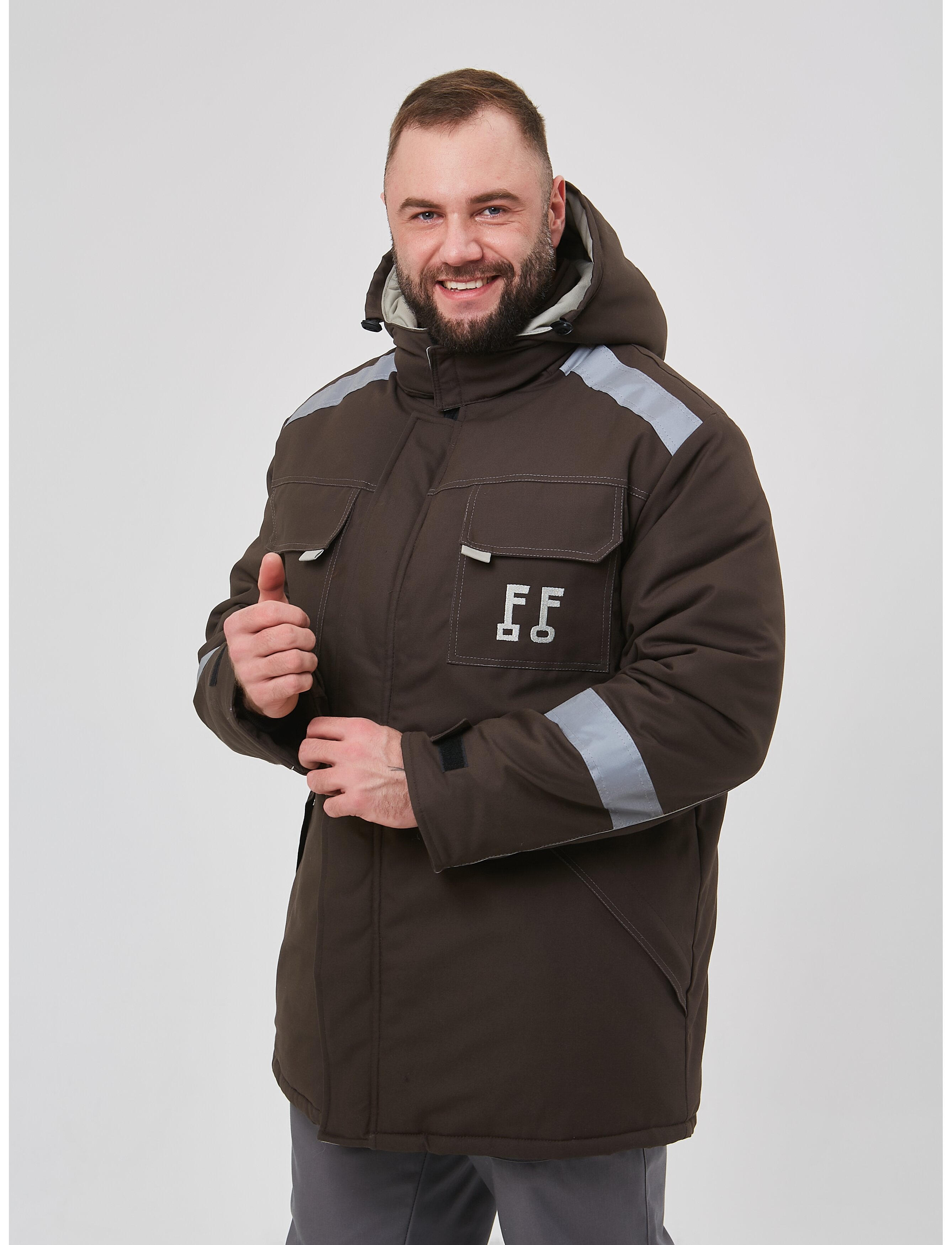 Костюм зимний рабочий КЗ-25-1 имеет центральную застежку на двухзамковую тесьму-молнию, с ветрозащитной планкой.Воротник-стойка, внутренний воротник из флиса, рукава втачные с внутренними трикотажными напульсниками, пять карманов (верхние накладные с клапаном с застежкой на ленту-контакт, нижние с вертикальным входом, внутренний карман на левой полочке с застежкой на тесьму-молнию)капюшон утепленный с широкой подбородочной частью, пристегивается на тесьму-молнию, регулировкой по ширине и высоте