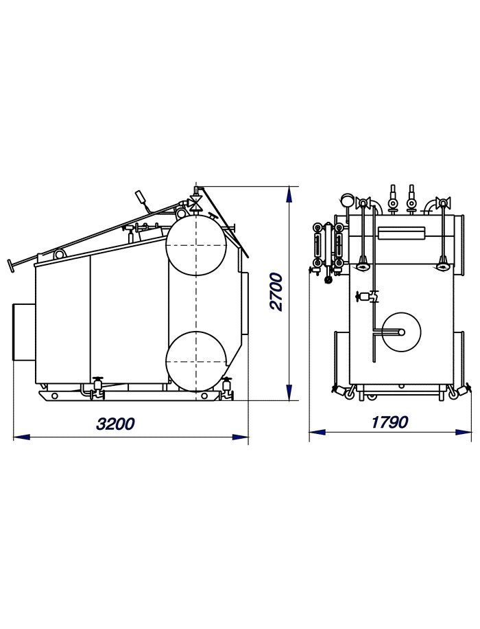 Котёл паровой Е-1,0-0,9М (КПН-1,0-9М) предназначен для получения пара, находящегося под избыточным давлением не более 0,8 МПа (8 кгс/см2/) и температурой не выше 170°С, используемого для технологических нужд при сжигании нормализованной нефти или мазута условной вязкостью не более 6 By. Котел Е-1,0-0,9 включает в себя блок котла, горелку и запорную арматуру. Блок парового котла Е 1,0-0,9 поставляется собранным на опорной раме, одним транспортным местом. Арматура поставляется отдельным транспортным местом (в ящике). По желанию заказчика котел Е 1,0-0,9 может комплектоваться питательным насосом, автоматикой безопасности, экономайзером, дымососом, оборудованием водо- и мазутоподготовки. Котел Е-1,0-0,9 представляет собой конструкцию, состоящую из верхнего и нижнего барабанов, конвективного пучка, а также потолочно-фронтового и боковых экранов, образующих топочную камеру. Топочная камера отделена от конвективной части газоплотным экраном, в котором имеется окно для выхода газов в конвективный пучок. Конвективный пучок состоит из коридорно-расположенных труб и одной перегородки, обеспечивающей разворот газов в пучке и их выход через окно в задней стенке котла Е 1,0-0,9. Трубная система котла Е 1,0-0,9 изготовлена из труб диаметром 51*2,5 мм. Наружная очистка труб от сажистых отложений осуществляется при помощи двух аппаратов паровой обдувки, расположенных на левой стенке котла, или механической очисткой при снятии разборной обшивки.Габариты котла - 3200*1790*2700 мм.