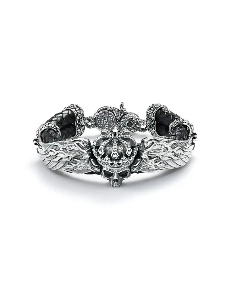 Кожаный браслет "Angel on fire" - это кожаный браслет с серебряными элементами. Основу браслета составляют два восьмимиллиметровых шнура из плетёной итальянской кожи, на которой располагаются серебряные детали: коронованный череп с объятыми пламенем крыльями и два звена с чёрной шпинелью. Концевики изделия, выполненные в стилистике браслета, крепятся к замку-карабину. Он обычно используется как элемент неформального, байкерского или рок-стиля для выражения дерзкого характера, уверенности и привлечения внимания. Чаще всего выполняется из черной кожи с металлическими элементами.