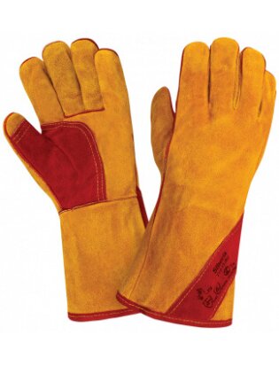 Краги спилковые Т12-11-RU желтые особопрочные перчатки сварщика предназначены для защиты рук от механических воздействий и повышенных температур из цельного спилка, пятипалые, с подкладкой из брезента и хлопка, длиной 350 мм (+10/-5мм). Спилок КРС специально отобранный для серии Siberia - только спинная часть шкур, прошедших предварительный отбор, спилок однородный, сорт АВ (1,4+/– 0,2 мм), шлифованный, желтого (золотого) цвета. Швы — оригинальная нить Кевлар, усилены вставками из кожи, на ладонной части и большом пальце дополнительный слой из спилка красного цвета. Флисовая подкладка из хлопка на кистевой части и льняная (брезент) в области манжета (краги), в серии Siberia, полностью прошита по периметру, что обеспечивает лучшую защиту и высокий комфорт. Перчатки сварщика Siberia обеспечивают высокую механическую защиту, защиту от повышенных температур - открытого пламени, искр и брызг расплавленного металла, высокий комфорт использования, предназначены для проведения сварочных работ, работ связанных с интенсивными механическими нагрузками в условиях повышенных температур, работ с металлом, рекомендованы для продолжительного ношения. Размер перчатки - 12,5 - это самый большой размер, который мы предлагаем на рынке. В сегменте перчаток сварщика и для работников металлургической промышленности нередко работают люди с большим размером руки. Наши перчатки полностью решают все проблемы обеспечения людей, с любым размером руки, качественными средствами защиты. Кроме того у перчатки специальная конструкция расширенного манжета для использования в зимнее время — широкий манжет позволяет заправлять рукава зимней одежды в крагу, а размер 12,5 позволяет применить дополнительную перчатку в качестве утепляющего вкладыша или защитного.