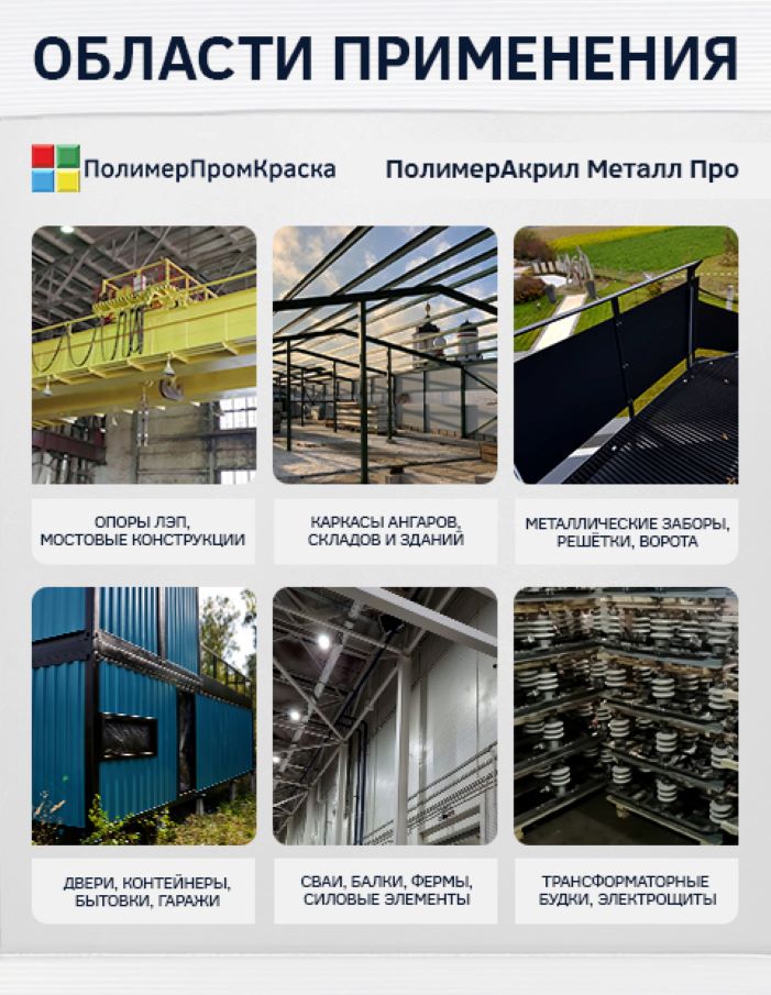 Применение: любые типы металлоконструкций, находящихся на открытом воздухе, внутри помещений, подвергающихся воздействию брызг морской воды: