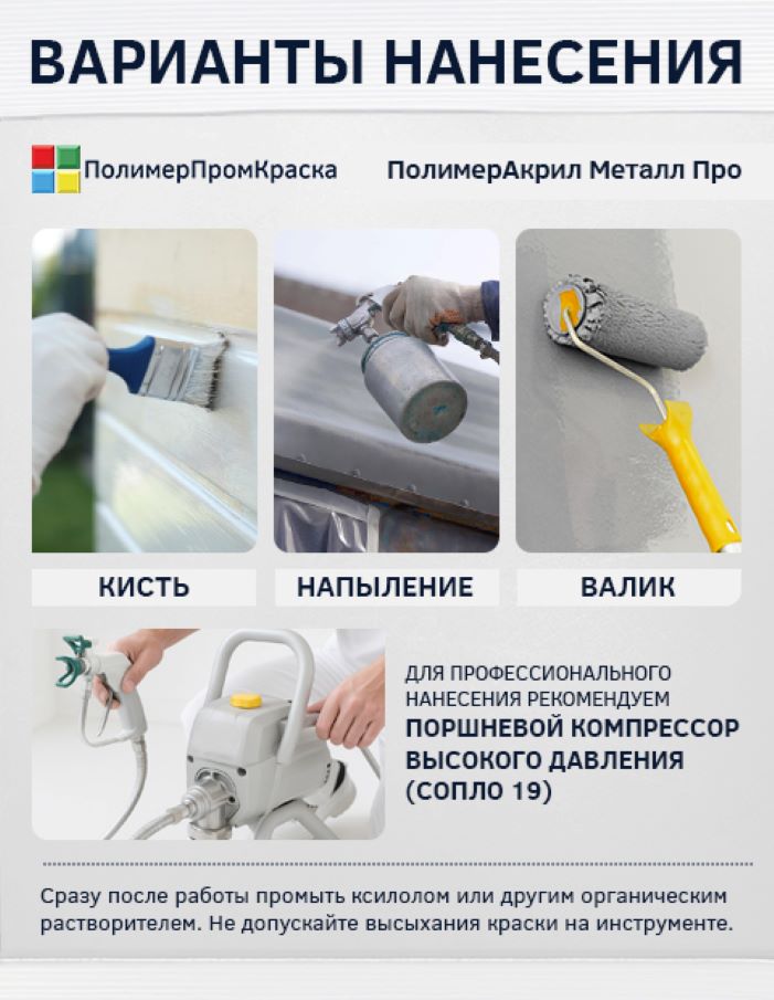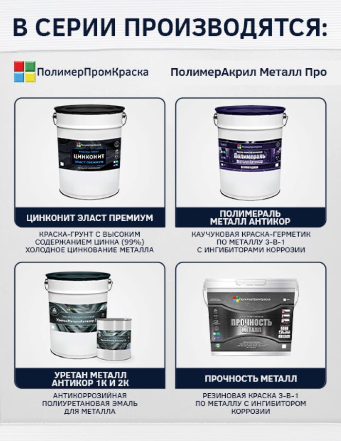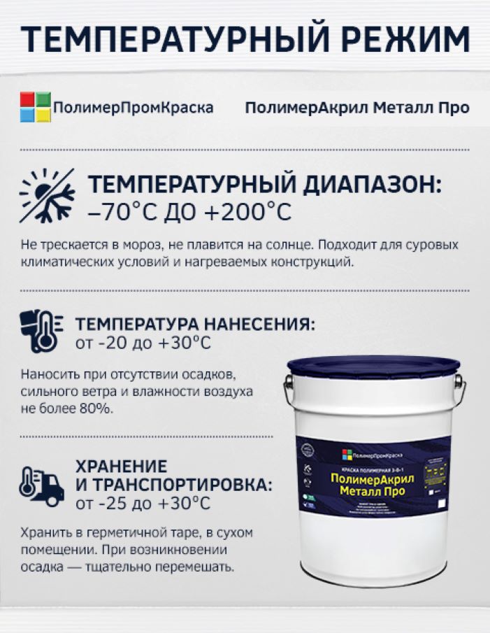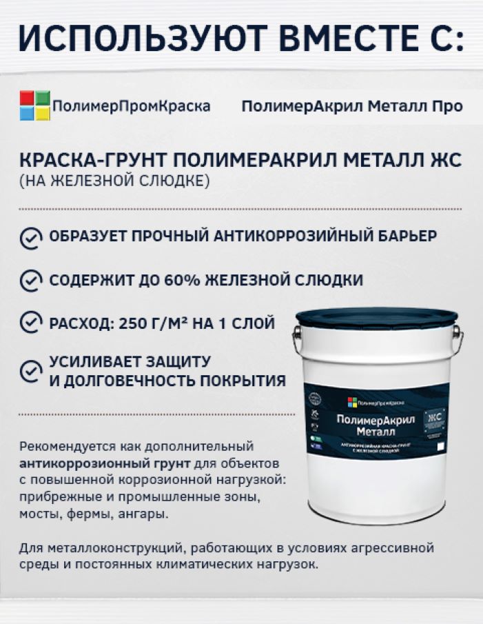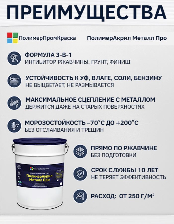 Краска полимерная ПолимерАкрил Металл Про – антикоррозийная акриловая краска по металлу на органической основе. Данная краска относится к краскам-грунтам с возможностью нанесения без грунтования поверхности в формате 3-в-1:
