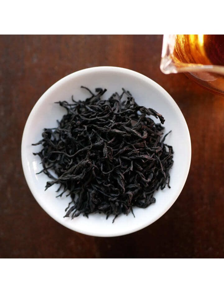 Сильноферментированный сильнопрожаренный цельнолистовой красный чай естественной скрутки. Выращен и изготовлен в чайном хозяйстве ЖиЮэТань.