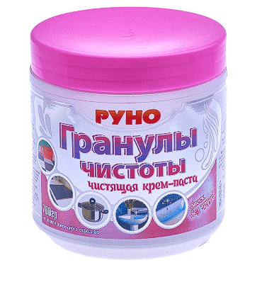 Многофункциональная универсальная Крем паста, РУНО Гранулы Чистоты, на основе мягкого природного абразива, для чистки разных поверхностей и мойки посуды. Высокоэффективная формула крем пасты быстро растворяет загрязнение изнутри, проникая его вглубь, а мягкий абразив устраняет его, не повреждая поверхности, оставляет после уборки легкий нейтральный аромат. Густая концентрированная текстура крем пасты обеспечивает продукту экономичный расход.