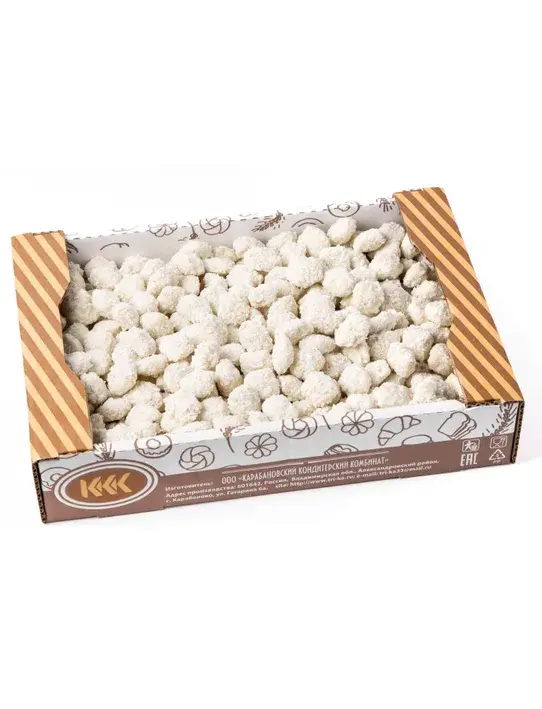 Кондитерские изделия, с кокосовой начинкой, глазированные белой глазурью, посыпанные кокосовой стружкой.