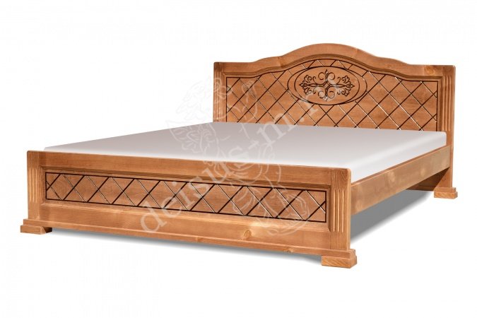 Просторная кровать поражает уникальной формой и оригинальным оформлением. Высокое изголовье и изножье оформлены в едином стиле. Поверхности декорированы интересным геометрическим рисунком. На самом видном месте нанесен красивый растительный орнамент. Особую надежность всей конструкции обеспечивают прочные деревянные ножки. Изделие покрыто слоем специального лака, защищающего поверхности от негативного воздействия влаги и механических повреждений. Кровать можно приобрести вместе с ортопедическим матрасом, обеспечивающим самое удобное положение во время сна или дневного отдыха.
