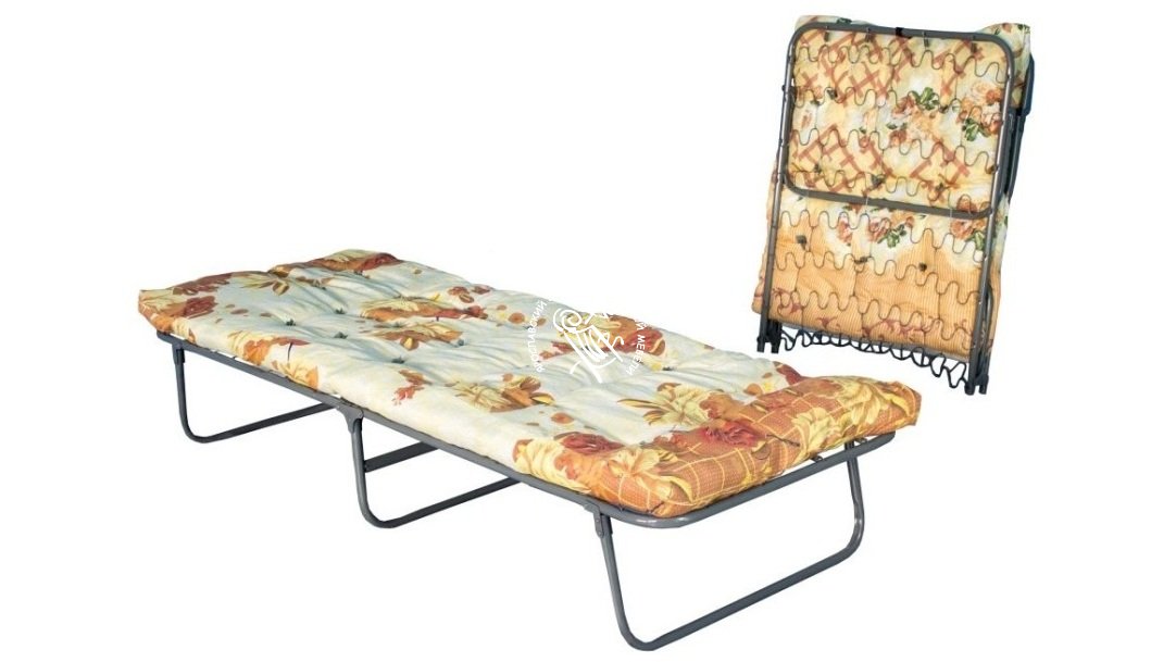 Раскладная кровать "Отдых-2М" со съёмным ватным матрасом. В данной модели используется пружина змейка как пружинная основа спального места. Допустимая нагрузку не более 120 кг. распределенного веса. Размер спального места 190х70х34 см. Категория раскладных кроватей Для взрослых Длина 1,9 м. Ширина 70 см. Высота 34 см. Диаметр трубы основания 22 мм.