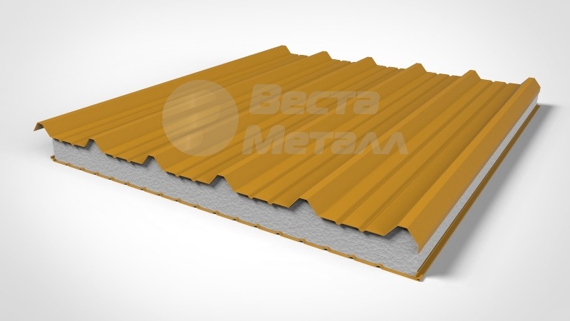 Кровельные сэндвич панели с ППС 50 RAL 1018 Светло-оранжевый - это трёхслойные конструкции, состоящие из двух металлических листов и теплоизоляционного слоя из пенополистирола (ППС) между ними. Они предназначены для быстрого и эффективного строительства крыш зданий различного назначения, так как обладают лёгкостью, хорошей теплоизоляцией и простотой монтажа. Толщина- 50мм. Материал - пенопласт. Средняя плотность- 15 - 25 кг/м3. Вес - 11,74 кг/м2 при толщине металла 0.5 мм. Максимальная длина -14000 мм. Общая ширина - 1000, 1190 мм. Толщина металла - 0,5 - 0,7 мм. Коэффициент теплопроводности - 0,039 ВТ/м К. Звукоизоляция -30 dB. Толщина сэндвич-панелей -50 мм. Разрушающее напряжение при изгибе -210 кПа. Напряжение сжатия при 10% деформации -110 кПа. Водопоглощение - 2 % объема за 24 часа. Горючесть - Г3 (нормальногорючие).