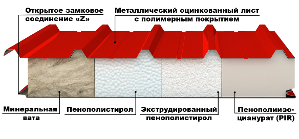 Кровельные сэндвич-панели - это эффективный материал, используемый для монтажа кровли различных сооружений. Кровельные сэндвич-панели представляют собой легкую трехслойную металлическую конструкцию. Она состоит из стального оцинкованного листа с полимерным покрытием и утеплителя. Все слои металла прочно соединены при помощи двухкомпонентного клея, обеспечивающего надежное крепление кровельных сэндвич-панелей. Размеры сэндвич-панелей: длина - от 2300 до 13000 мм., ширина - 1000 мм., толщина - от 40 - до 300 мм.