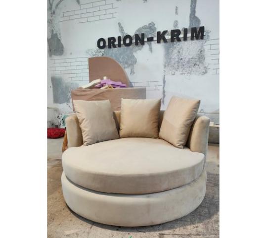 Круглый диван для отдыха от студии мебели «ORION-KRIM», г. Симферополь. Диаметр 1,25 м. Каркас выполнен из ДСП, дерева и фанеры, собран на клею и болтах. Подушка сидения из ППУ повышенной плотности и комфортности, чехол сидения съёмный. В комплекте 3 подушки спинки 45*45 см. с внутренними чехлами из габардина, лицевые чехлы съёмные на потайных молниях. Диван может быть выполнен по вашему желанию в любом цвете. Мы изготавливаем качественную дизайнерскую мебель на любой вкус. Вы можете ознакомиться с полным ассортиментом на нашем сайте. Достака возможна в любой регион России как транспортом нашей фабрики, так и транспортными компаниями. Приглашаем к сотрудничеству всех заинтересованных лиц