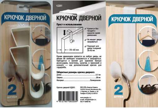 Крючок дверной КД001 одним движением крепится на любую дверь, не мешая ей свободно открываться и закрываться. Пригодится в ванной для хранения банных аксессуаров, полотенец, халатов; в прихожей и комнате - как дополнительный крючок для гардероба. Крепится без гвоздей и шурупов. Подходит для дверей толщиной - 35-40 мм. Не мешает двери закрываться. Размер - 117*28 мм. Материал - полипропилен. Упаковка - 2 крючка. Цвет - белый.
