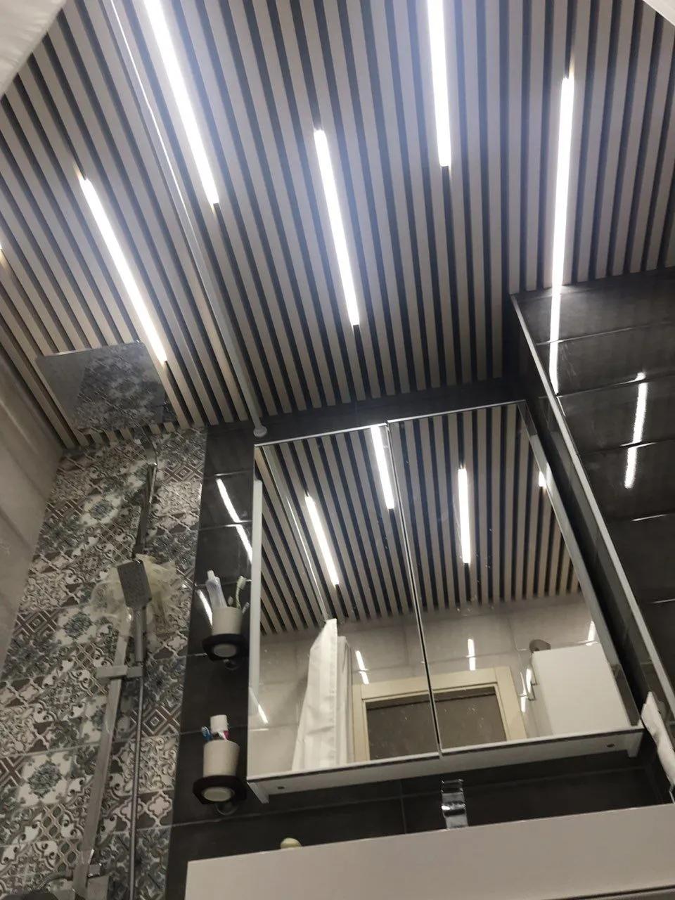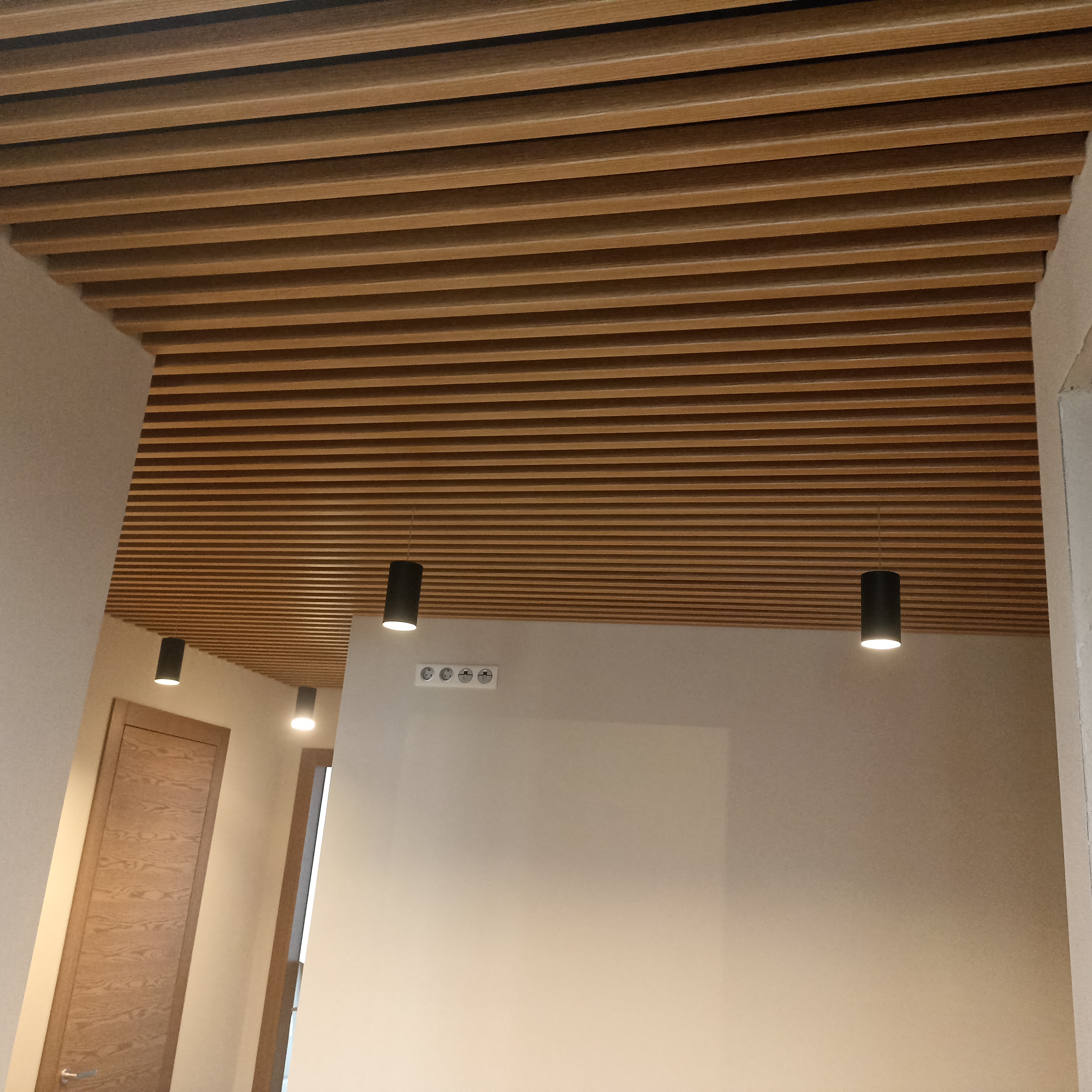 - 3D-эффект и глубина: Визуально разделяет пространство, добавляет помещению объем, динамику и архитектурную выразительность. Идеально скрывает неровности базового потолка.