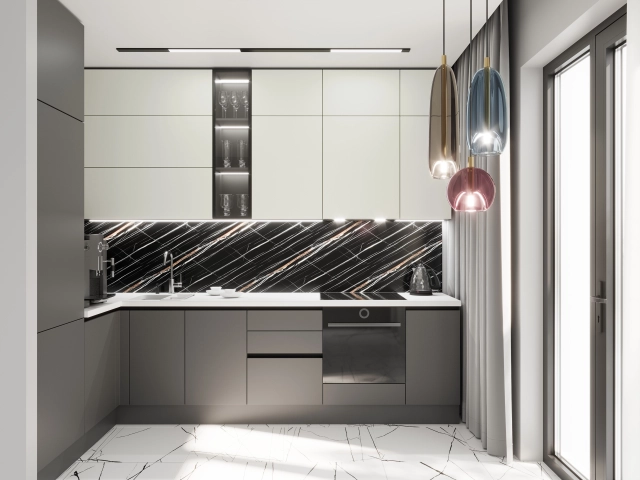 Обаятельная кухня Порту станет идеальным выбором для тех, кто ценит уют и умиротворение. Нейтральные серые оттенки гармонично сочетаются с мраморным декором, который, как символ неизменной красоты и долговечности, придает интерьеру особый шарм. Каждая деталь кухни тщательно продумана, чтобы обеспечить не только эстетическое наслаждение, но и функциональность на высшем уровне.