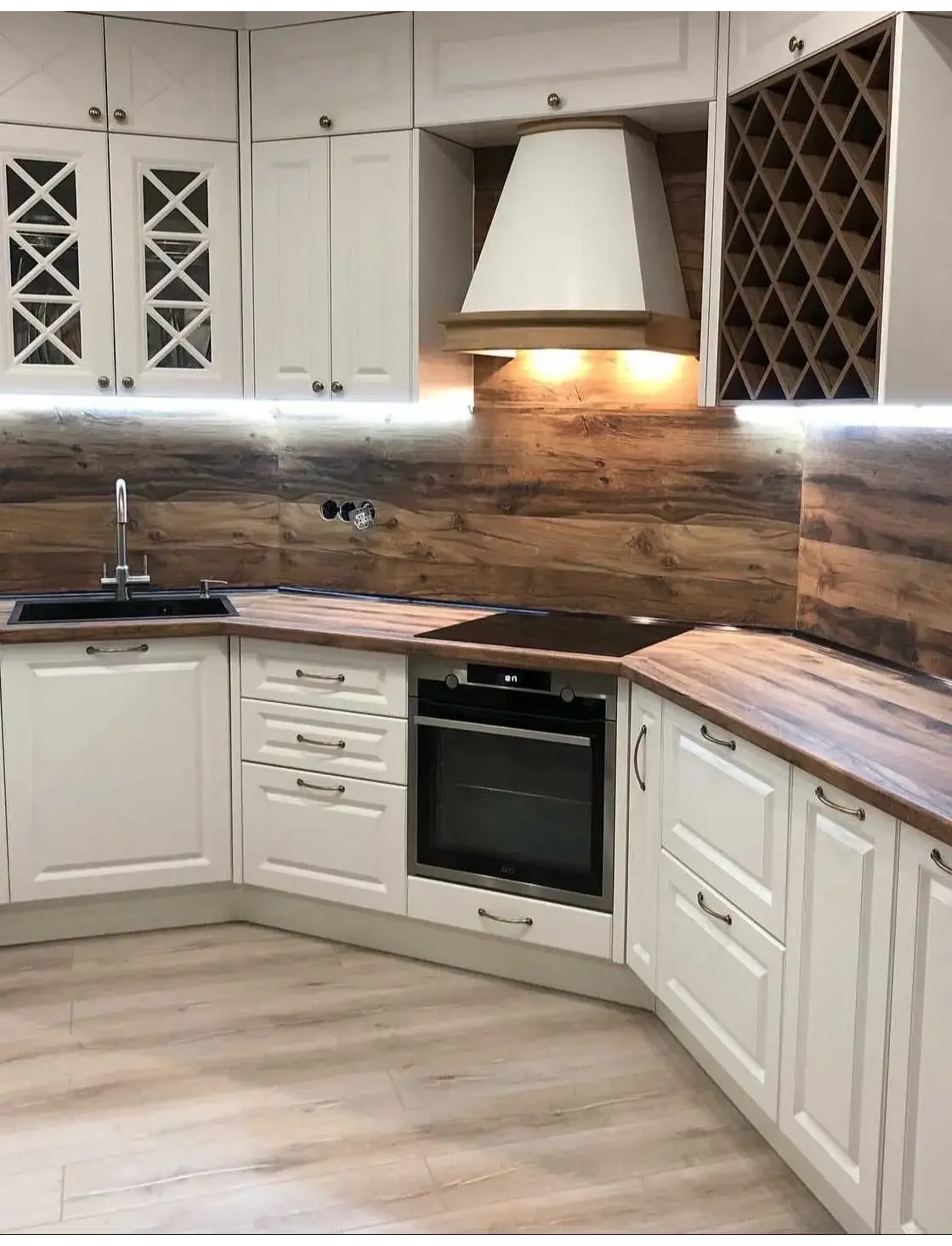 Кухня в скандинавском стиле с неоклассической фрезеровкой и латунными ручками.