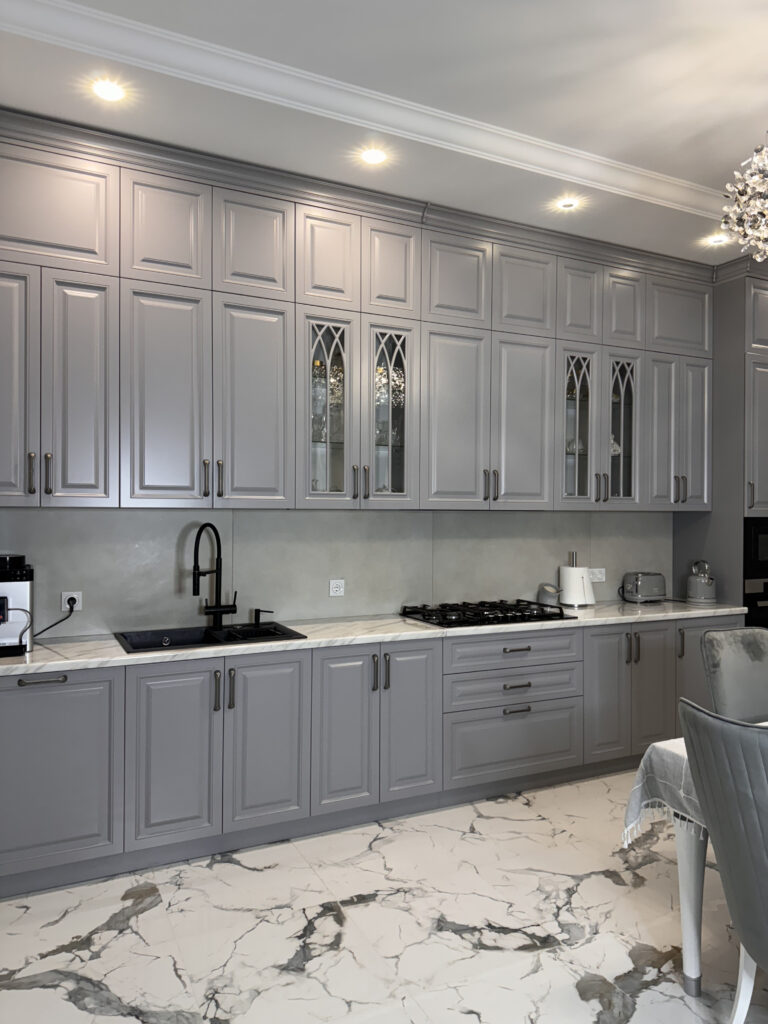 Кухня с фасадом из МДФ, покрытой эмалью по каталогу NCS, с красивой, геометрической фрезеровкой «Квадро», выполнена в неоклассическом стиле. Фасады серого цвета, строгие линии фасадов, верхние шкафы в потолок, говорят о готовности хозяев к веяниям новых трендов. Стеклянные витрины с готической фрезеровкой и подсветкой, создают атмосферу чопорности и торжественности. Вся техника, кроме холодильника, встроенная.