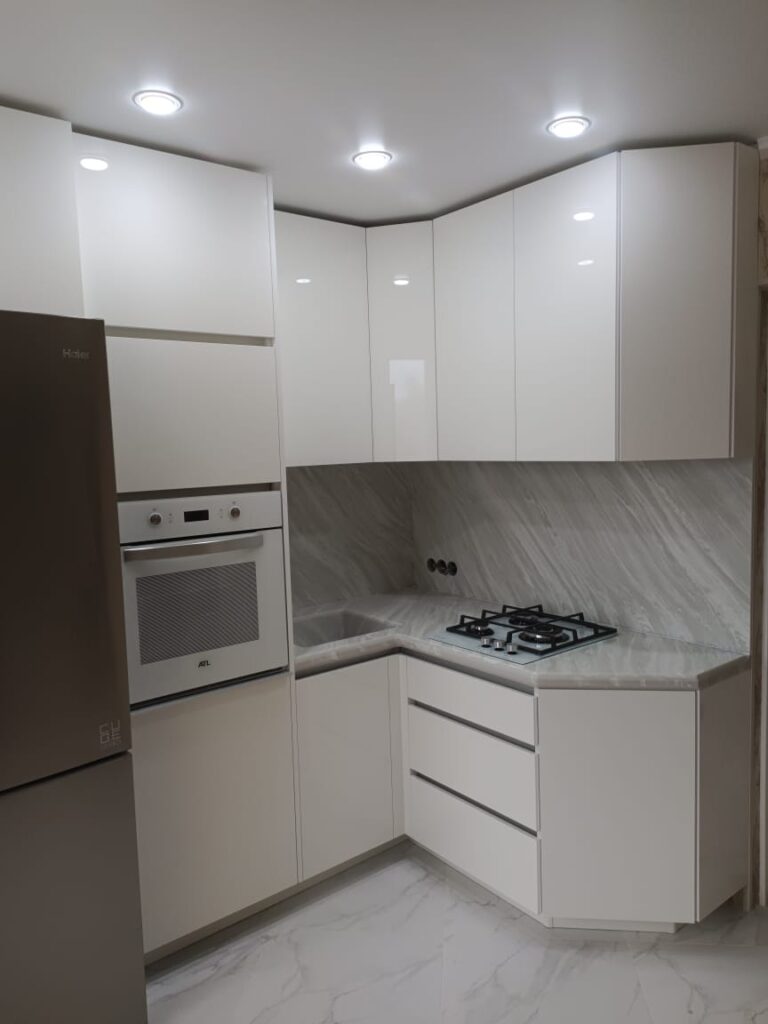 Форма кухни угловая, под потолок Фасад ACRIL Белый глянец Цвет фасада по каталогу Каркас ЛДСП ЭГГЕР (Австрия) Столешница и пристенная панель искусственный камень Staron Samsung Мойка искусственный камень Staron Samsung, интегрированная в столешницу Выдвижные ящики Hettich Atiro (Германия) Петли Hettich Silent system (Германия)
