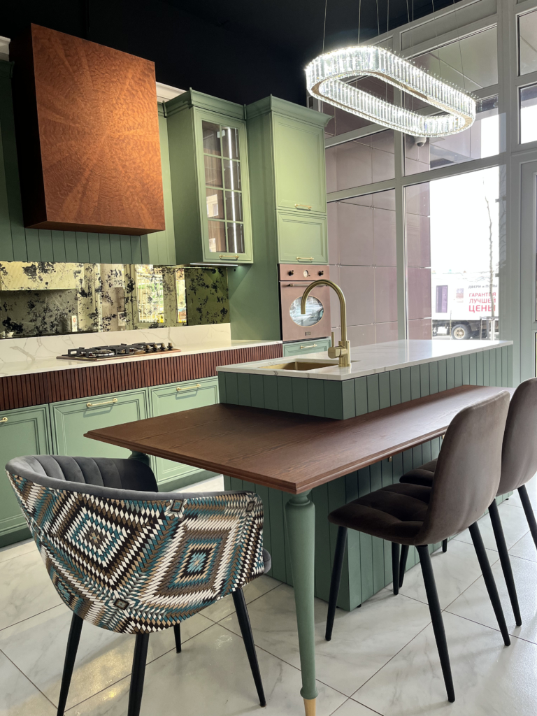 Кухня с фасадом из МДФ, покрытой супер матовой эмалью по каталогу NCS, с красивой, сложной фрезеровкой «Американо», выполнена в неоклассическом стиле. Фасады сложного зеленого цвета, сочетаются с натуральным цветом шпона «Сапели поммеле» . Стеклянные витрины с подсветкой, придают кухне торжественности, создают атмосферу праздника. Столешница из кварцевого агломерата.