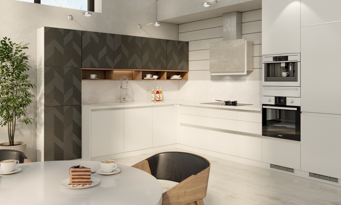 Кухня «Ангара» — природная гармония в современном исполнении Стиль: Современный с натуральными акцентами Материалы: Фасады: МДФ с покрытием: Натуральный шпон — древесные текстуры с эффектом 3D Матовый лак — подчеркивает природную красоту дерева Ручки: Кованые металлические или скрытый профиль Столешница: Искусственный камень с древесным рисунком Особенности: ✔ Объемные фасады — 3D-эффект натурального дерева ✔ Экологичные материалы — безопасные для здоровья покрытия ✔ Теплые цветовые решения — от светлого дуба до темного венге ✔ Фирменный декор — кованые элементы ручной работы Преимущества: ✅ Аутентичный внешний вид — трудно отличить от массива дерева ✅ Устойчивость к влаге — специальная обработка шпона ✅ Легкий уход — не требует специальных средств ✅ Уникальность — естественные вариации древесного рисунка Технические детали: ▸ Толщина фасадов: 22 мм ▸ Фурнитура: Blum с системой плавного закрывания ▸ Цветовая палитра: Светлые: беленый дуб, норвежская сосна Темные: черный орех, темный венге ▸ Дополнительно: Возможна установка витражных вставок Для кого? Для ценителей натуральных материалов Для любителей экологичного дизайна Для тех, кто ищет баланс современности и традиций «Ангара» — кухня, в которой живет дух природы.