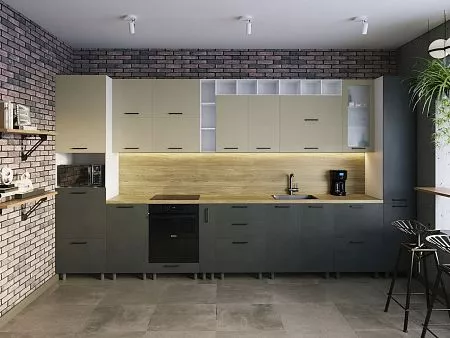 Серийная модульная кухня «Гармония 11» привлекает своей функциональностью, эргономичностью и стильным дизайном. Фасады Мыло имеют гладкую приятную на ощупь поверхность. На выбор клиента – шесть вариантов цветового решения, каждый из которых отвечает модным тенденциям в интерьере. Есть возможность комбинировать в одном комплекте разные цвета, например, навесные шкафы одного колера, рабочие столы – другого. Компактная прямая конструкция минималистского дизайна отлично организует интерьер в стиле лофт. Каркасы в наличии на складе, а фасады изготавливаются за 21 день, поэтому выполнения заказа долго ждать не придется.