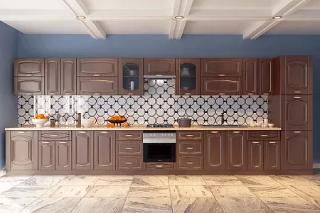 Кухонный гарнитур из серии «Дуб золотой» – это элегантное благородство классики в сочетании с комфортом и функциональностью. Благодаря большому количеству модулей можно подобрать комплект для помещения как небольшого, так и просторного. Эта особенность позволяет также построить композицию прямую, угловую или П-образную. Корпус изготовлен из ЛДСП с защитной кромкой ПВХ, предохраняющей мебель от износа. Материал фасада – также экологичная ЛДСП. Цвета классические: Орех Гварнери и Дуб золотой. Фасад с эффектной фрезеровкой – двойная рамка рондо с фигурными ступеньками. Предусмотрен стол под духовой шкаф и ниша для бытовой техники.