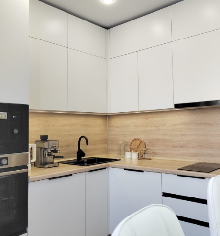 Корпус: ЛДСП, Белый Фасад: МДФ с ПВХ, Снежно-белый Столешница: Канадский дуб Фартук: Канадский дуб Руки ср.ряд: утопленное дно Ручки низ: торцевая врезная + накладная, черный цвет Ящики: с доводом, скрытого монтажа Петли: с доводом Подъемный механизм: газ-лифт + Tip-On Посудосушитель: 900мм, хром Лоток под столовые приборы Мойка: Q560, мрамор, черного цвета Лента, трансформатор Свет подсветки: нейтральный Включатель: сенсорный