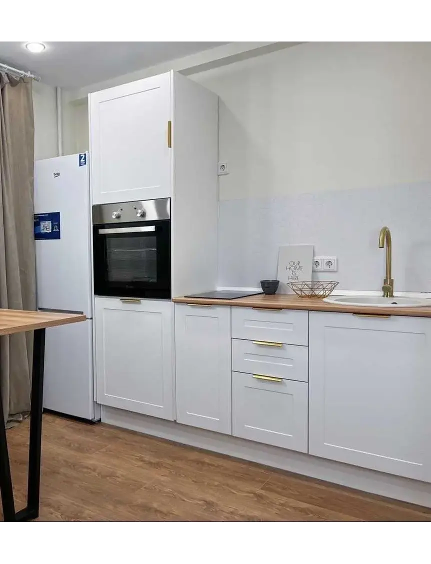 Светлая и уютная кухня с белыми фасадами из МДФ в пленке. Неоклассическая фрезеровка и золотые ручки придают кухне легкость и элегантность.