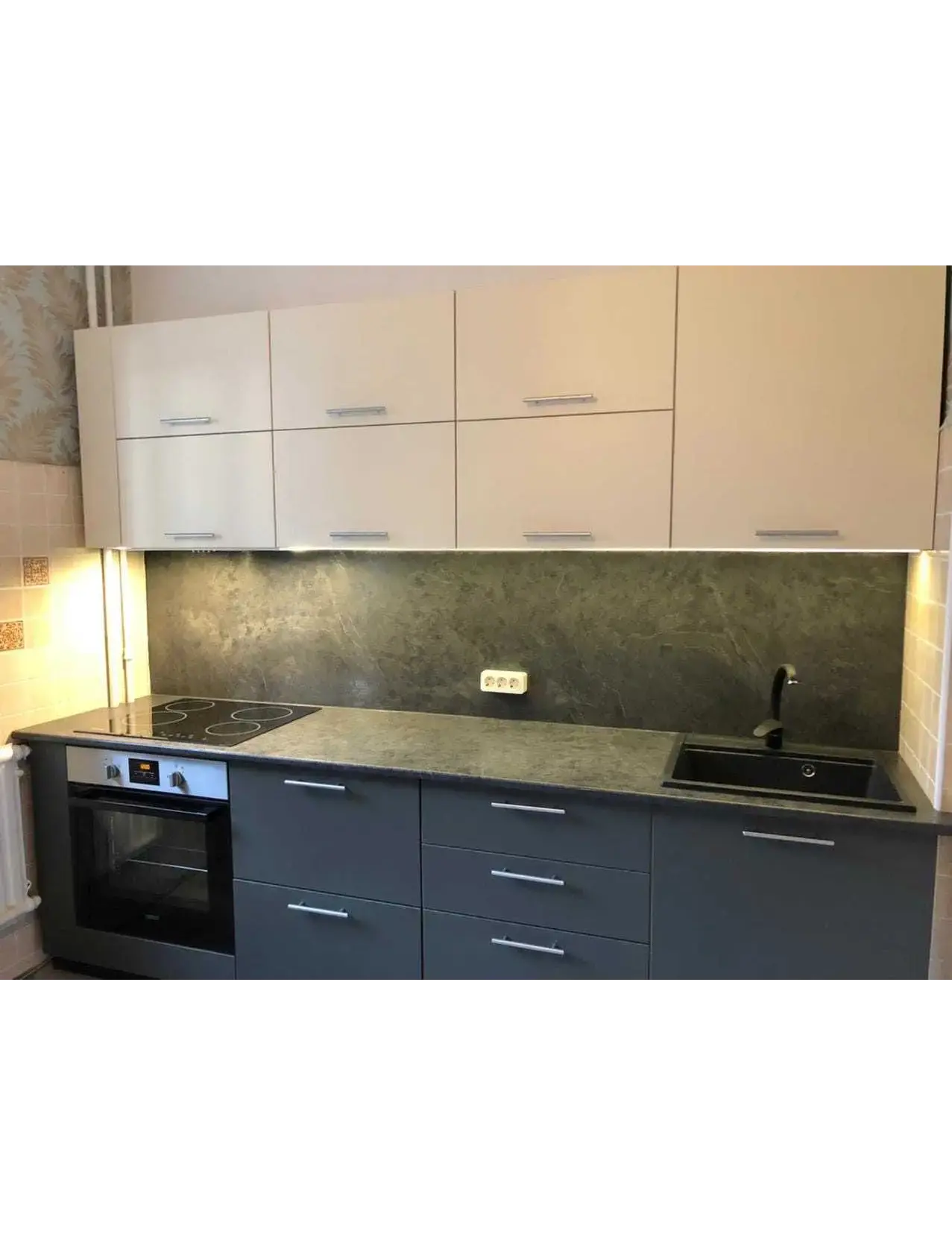 Небольшая кухня из пластиковых фасадов в цвете Графит и Бежевый Выполнены бесшовные стыки стеновой панели и столешницы , а так же врезной профиль подсветки в единое дно.