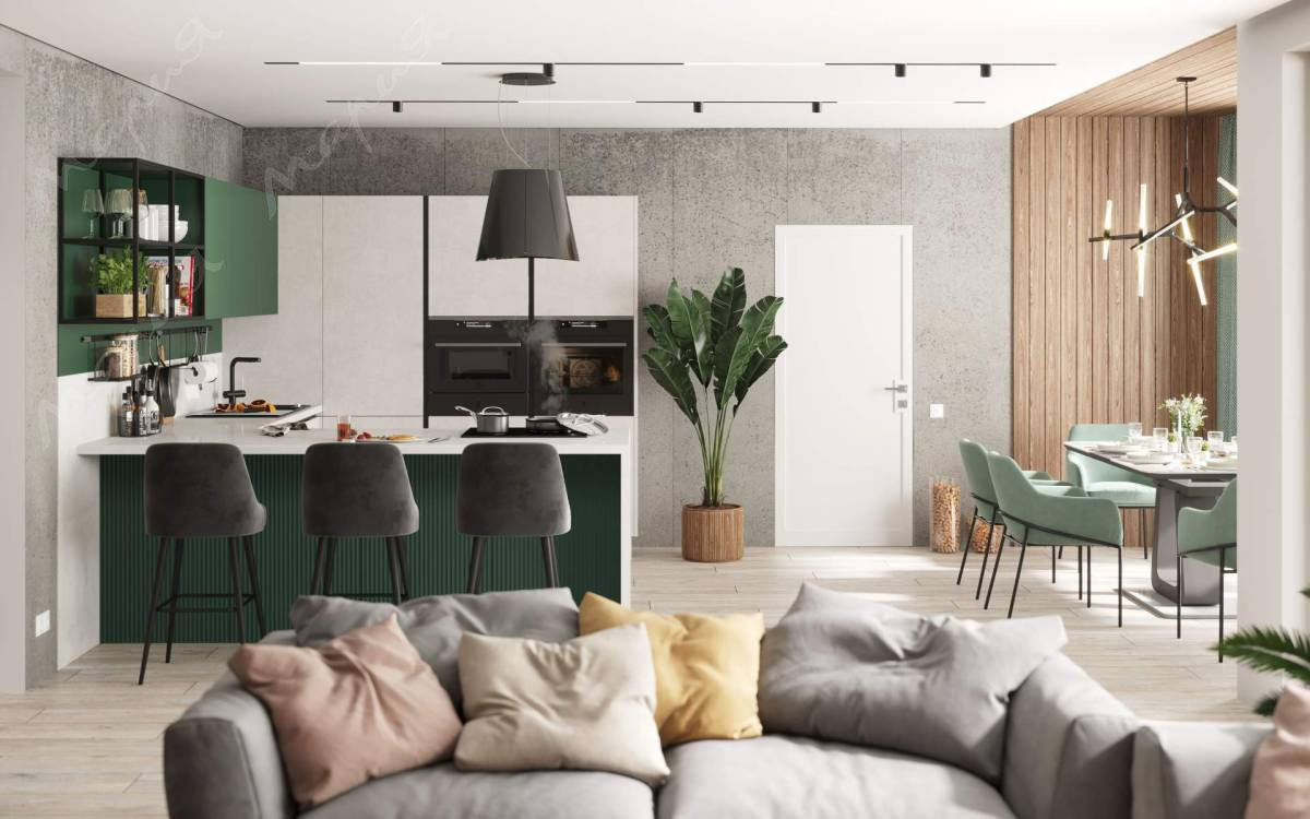 Сочетание гладких фасадов и актуальных с «полосатой» фрезеровкой, напоминающей рейки и планкен. Эксклюзивные скрытые врезные ручки, установленные в фасад. Высокие фасады с системами открывания, позволяющие трансформировать кухню, скрыв рабочую зону.