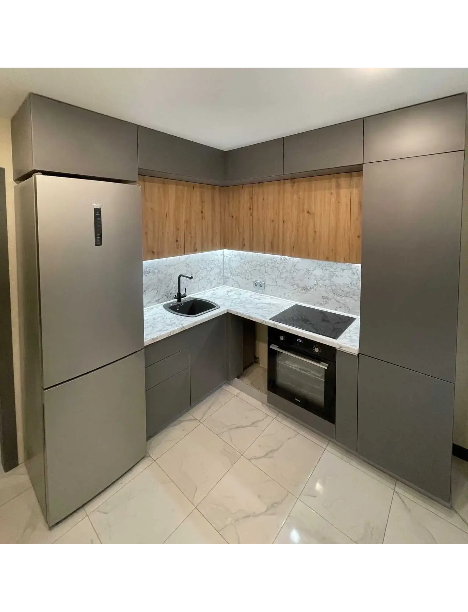 Фасады и корпус в декоре из австрийского EGGER Оникс Серый и Дикий Дуб. Сочетание цветов отлично гармонируют друг с другом, а столешница и стеновая панель придают легкость и свежесть в зоне готовки.