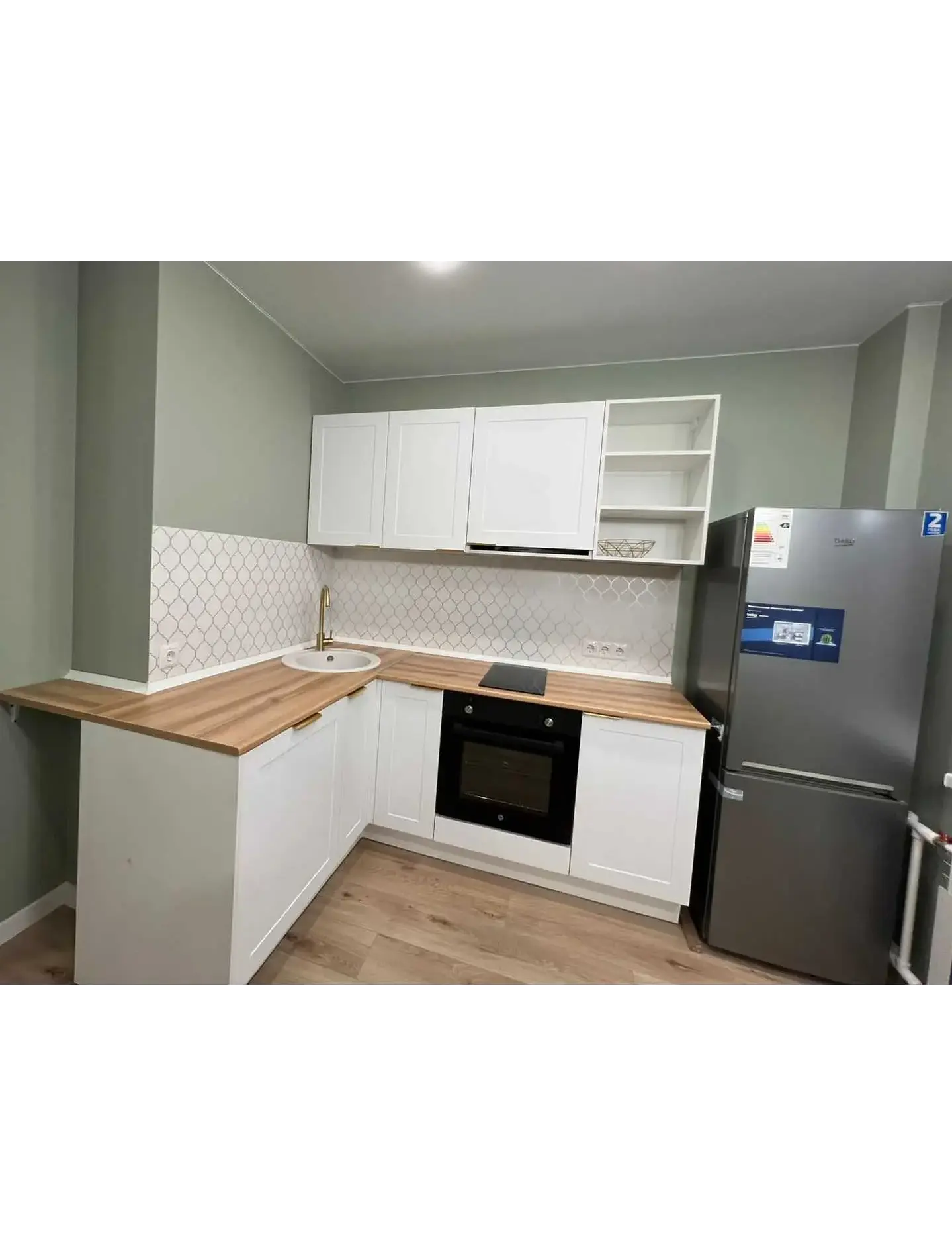 Светлая и уютная кухня с белыми фасадами из МДФ в пленке. Неоклассическая фрезеровка золотые ручки, фартук - соты, столешница ЛДСП под дуб.