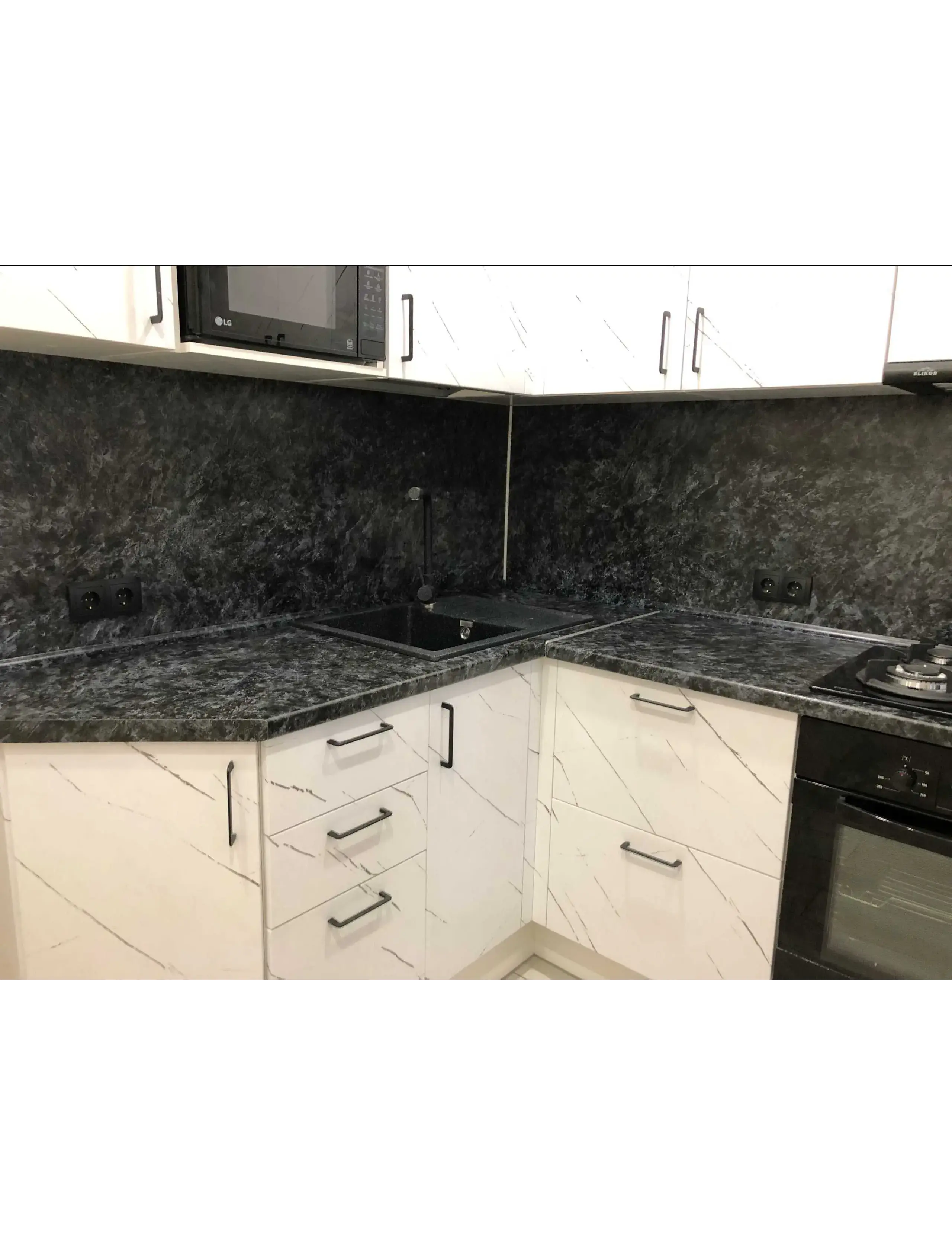 Небольшая, но в то же время очень вместительная кухня с фасадами под Итальянский мрамор в пленке . Черные ручки добавляют акцент и делают кухню очень привлекательной