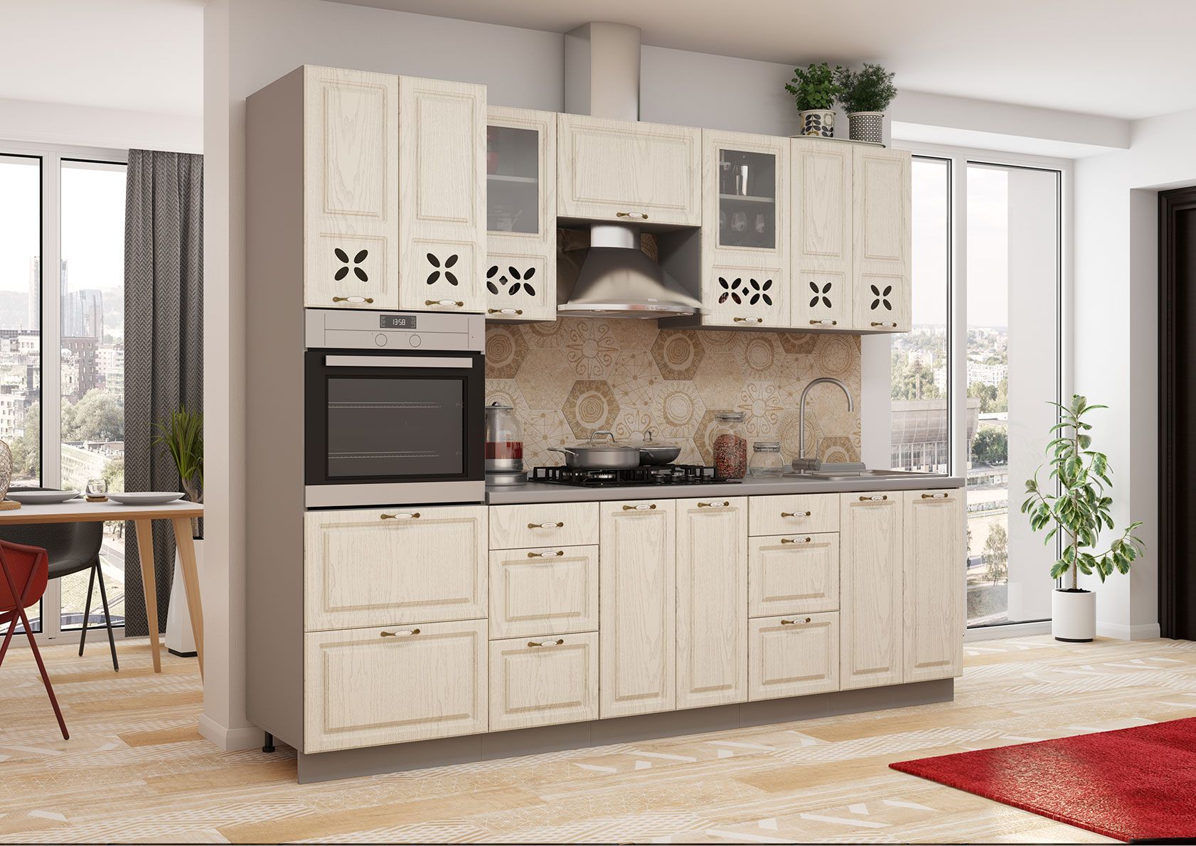 Ручка - 96 мм Опора - на цоколях Стекло - стекло постое Столешница - берилл бежевый; кастилло темный; марсель Хотите готовить и проводить время на кухне с удовольствием? Укомплектуйте помещение красивой и удобной мебелью — закажите гарнитур «Ампир»! Комплект эстетичен и функционален. В него входят все необходимые для создания идеальных условий элементы. Холодные оттенки поддерживают праздничное, романтическое настроение. Немного гламура в обстановку вносят прорезные орнаменты на дверцах подвесных шкафчиков.